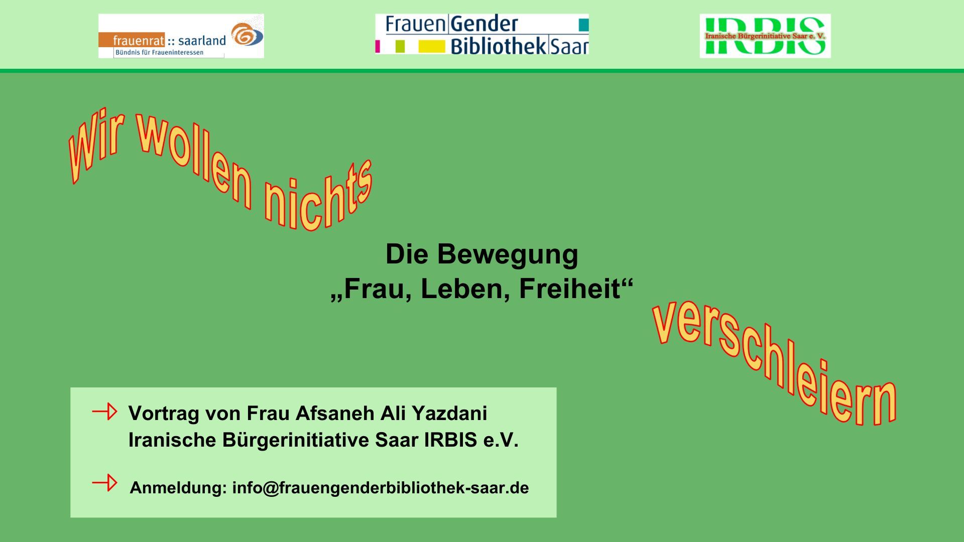 Frauenrat Saarland, FrauenGenderBibliothek und Iranische Bürgerinitiative Saar IRBIS e. V. laden zum Vortrag mit Faktencheck in die FrauenGenderBibliothek Saar, Großherzog-Friedrich-Straße 111, 66121 Saarbrücken und online ein.